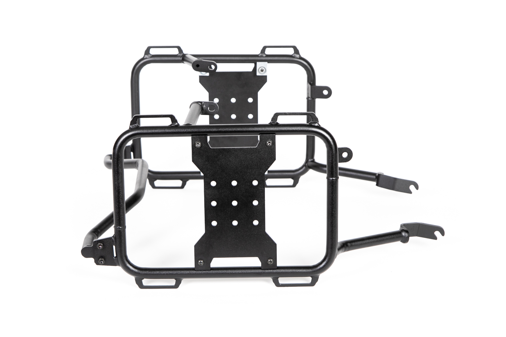 Cadres en acier peint époxy noire avec un support en X en aluminium. Plusieurs positions de montage pour une répartition du poids personnalisée, ainsi que plusieurs points d’arrimage. Vous pouvez même retirer le X de vos cadres lorsque vous utilisez des bagages rigides pour réduire le poids.