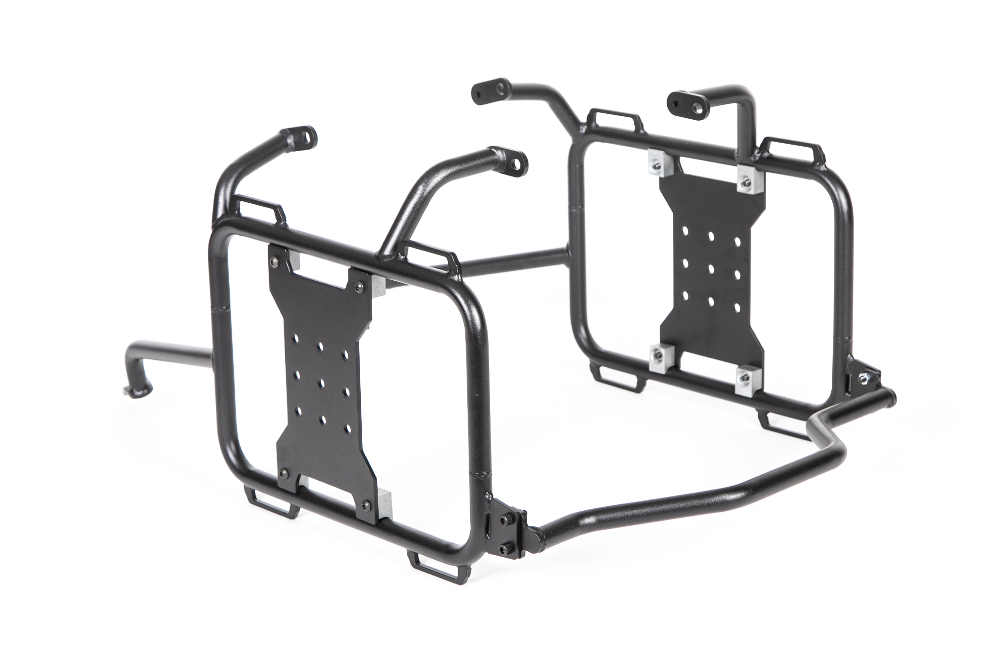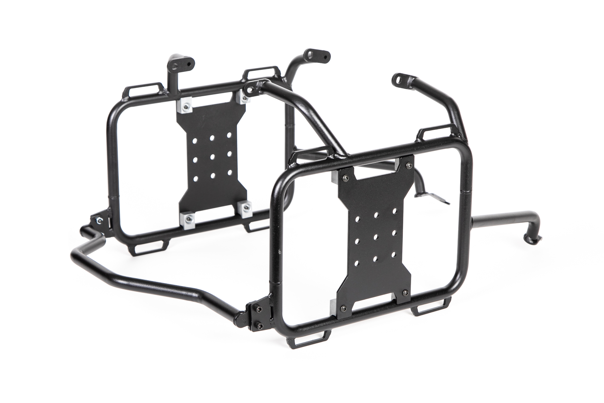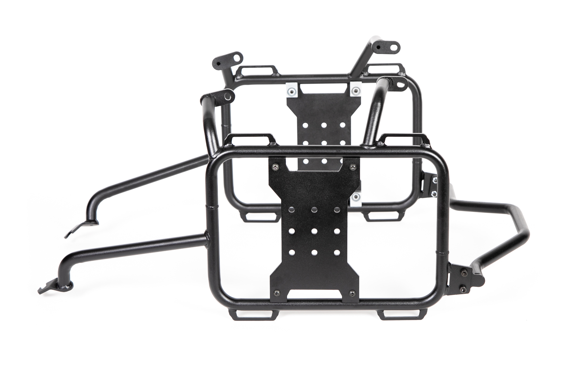 Cadres en acier peint époxy noire avec un support en X en aluminium. Plusieurs positions de montage Rotopax pour une répartition du poids personnalisée, ainsi que plusieurs points d’arrimage. Vous pouvez même retirer le X de vos cadres lorsque vous utilisez des bagages rigides pour réduire le poids.