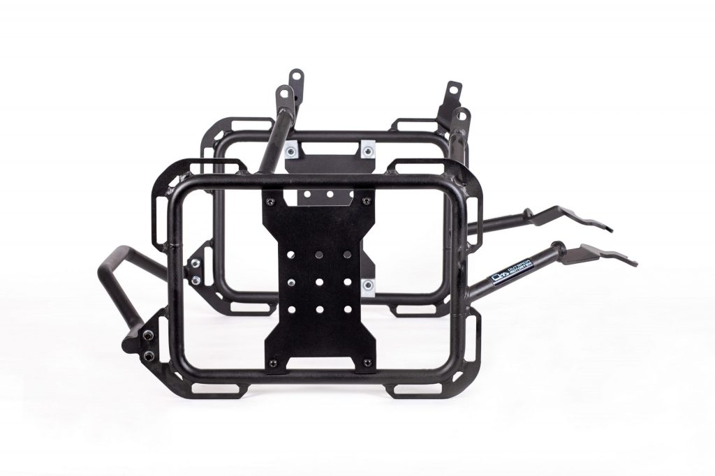 Cadres en acier peint époxy noire avec un support en X en aluminium. Plusieurs positions de montage Rotopax pour une répartition du poids personnalisée, ainsi que plusieurs points d’arrimage. Vous pouvez même retirer le X de vos cadres lorsque vous utilisez des bagages rigides pour réduire le poids.